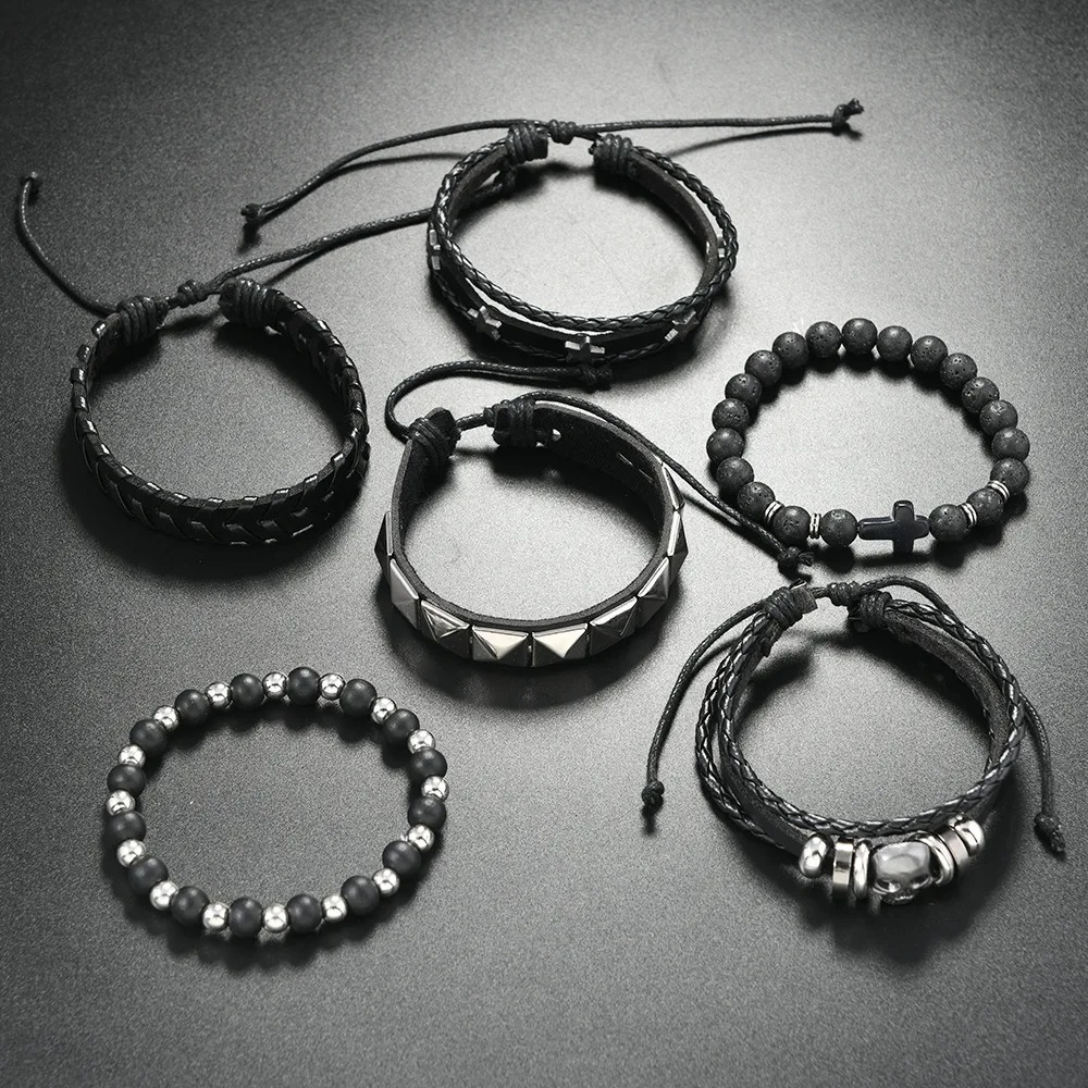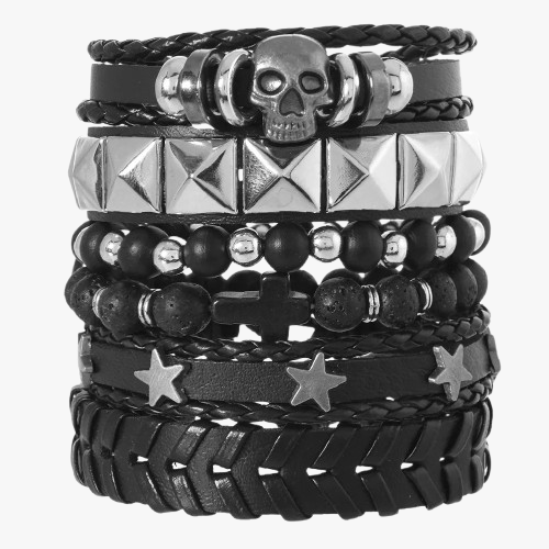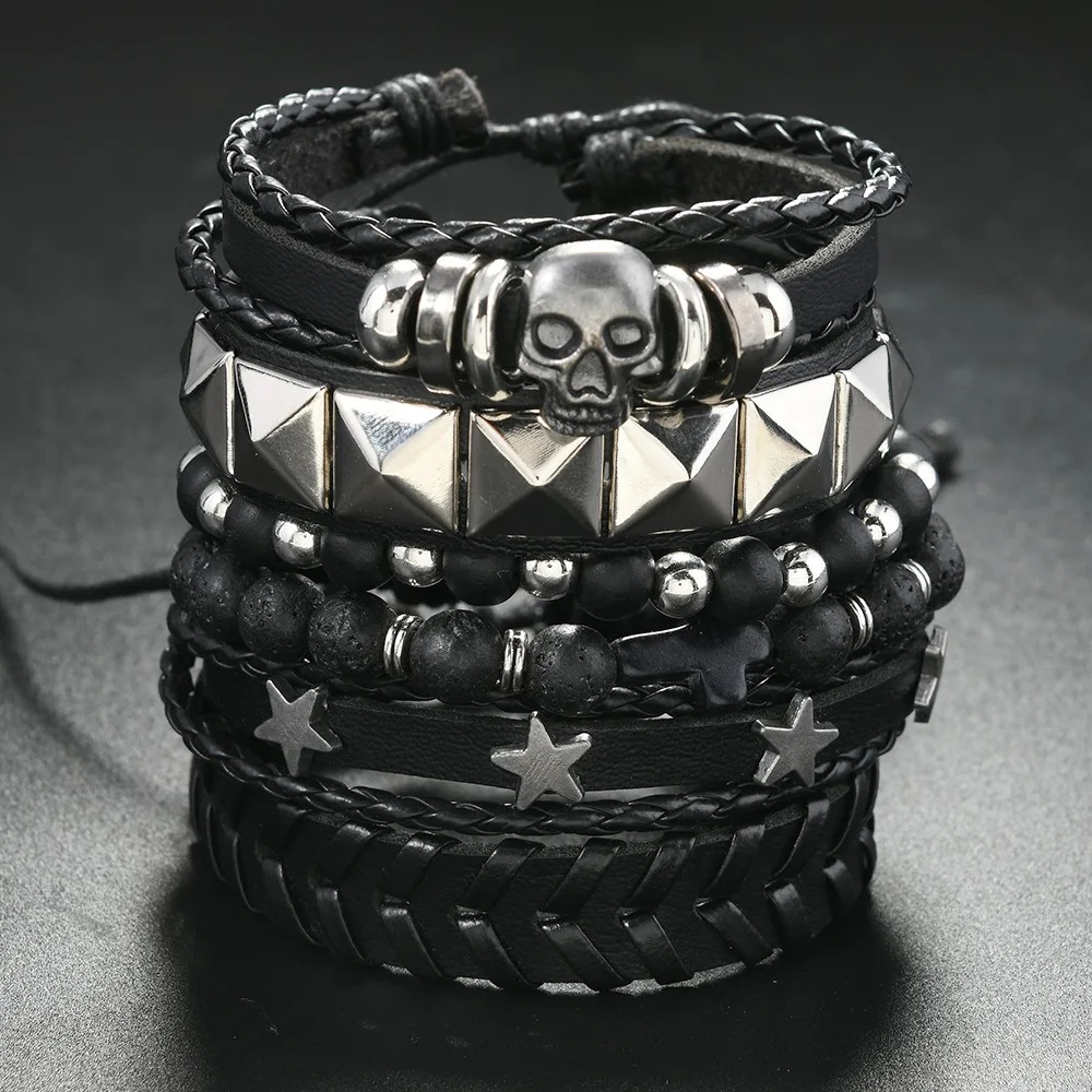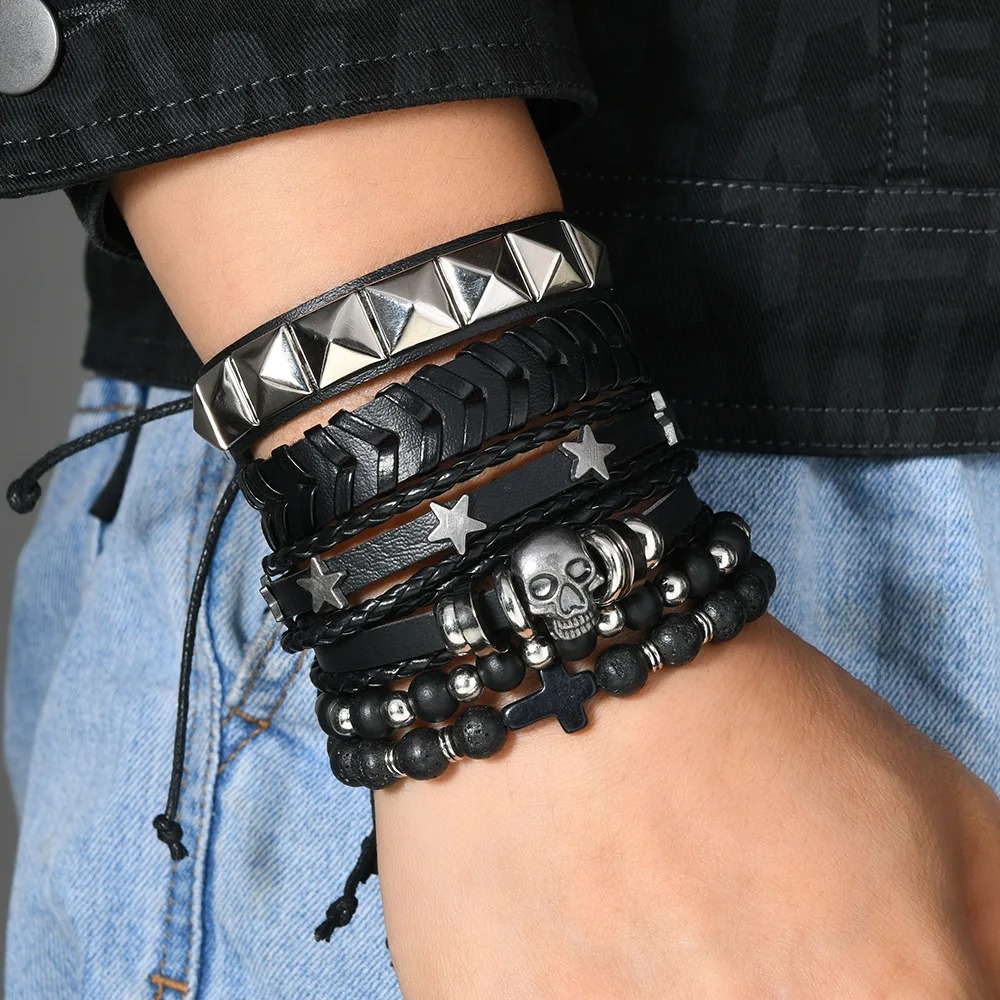 Bracelet Multicouche Homme en Cuir et Corde – Style Punk, Croix et Étoile