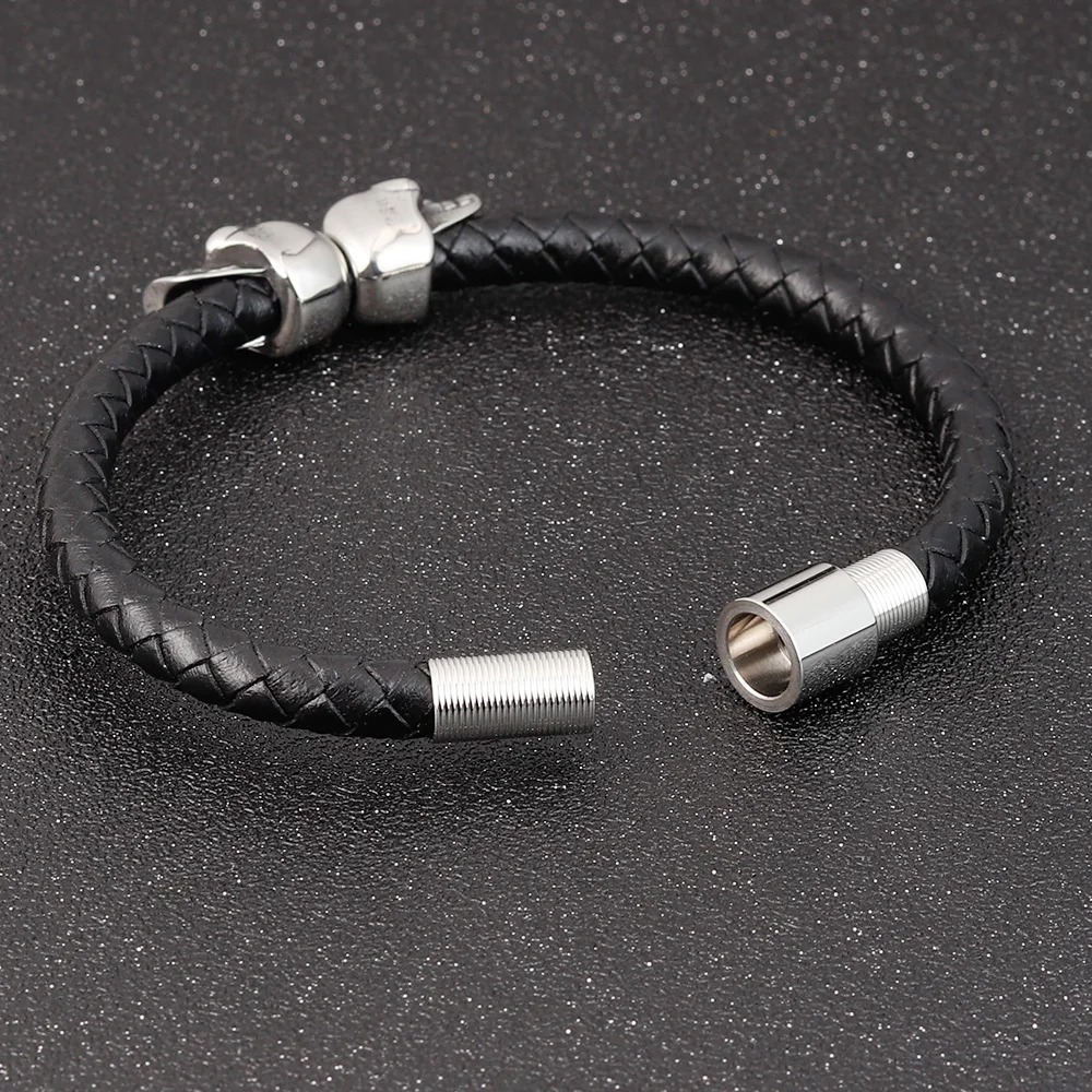 Bracelet Homme en Cuir Véritable Noir et Acier - Look Viking